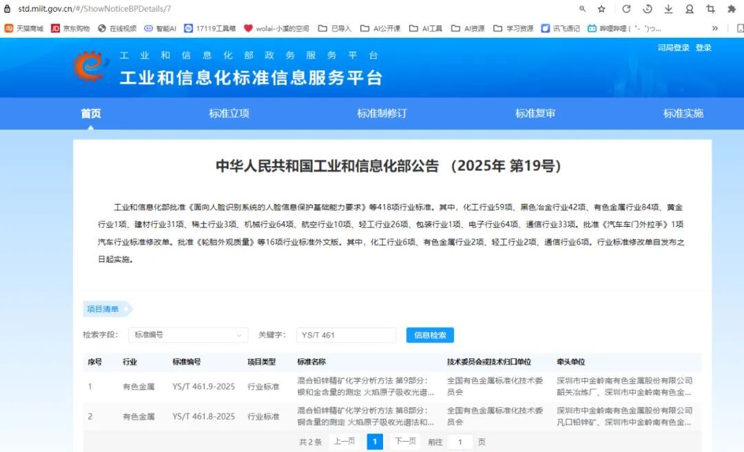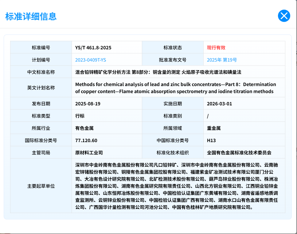 近日,工业和信息化部发布2025年第19号公告168配资,由中金岭南凡口矿(以下简称“凡口矿”)主起草的行业标准:YS/T461.8—2025《混合铅锌精矿化学分析方法第8部分:铜含量的测定 火焰原子吸收光谱法和碘量法》获得批准,将于2026年3月1日正式实施。